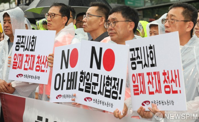 [서울=뉴스핌] 백인혁 기자 = 전국공무원노동조합 회원들이 7일 오전 서울 종로구 일본대사관 앞에서 아베정권 규탄·한일군사정보 보호협정 폐기를촉구 기자회견을 하고 있다. 2019.08.07 dlsgur9757@newspim.com