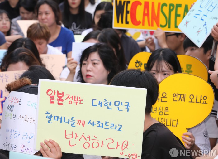[서울=뉴스핌] 백인혁 기자 = 7일 오후 서울 종로구 옛 일본대사관 앞에서 정의기억연대 주최로 열린 ‘제1399차 일본군 성노예제 문제해결을 위한 정기 수요시위’에서 참가자들이 손 피켓을 들고 있다. 2019.08.07 dlsgur9757@newspim.com