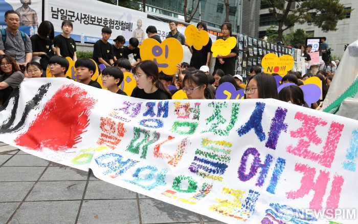 [서울=뉴스핌] 백인혁 기자 = 7일 오후 서울 종로구 옛 일본대사관 앞에서 정의기억연대 주최로 열린 ‘제1399차 일본군 성노예제 문제해결을 위한 정기 수요시위’에서 참가자들이 손 피켓을 들고 있다. 2019.08.07 dlsgur9757@newspim.com