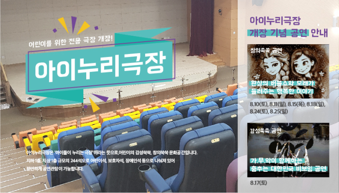 한편, 이번에 개관하는 아이누리극장은 지하 1층, 지상 1층의 전체 224석 규모로 어린이석, 보호자석, 장애인석 등 이용자별로 좌석을 달리해 이용에 편리함을 더했다. 최고의 음향시설, 무대장비와 함께 어린이 전용 극장에 특화된 공연들을 선보일 예정이며 대관도 가능하다.