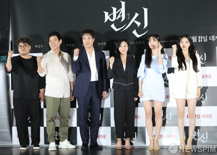 [서울=뉴스핌] 백인혁 기자 = 12일 오후 서울 광진구 롯데시네마 건대입구점에서 열린 영화 '변신' 언론시사회에서 김홍선 감독과 배우들이 취재진을 향해 포즈를 취하고 있다. 2019.08.12 dlsgur9757@newspim.com