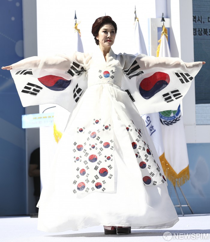 [서울=뉴스핌] 이한결 기자 = 14일 오전 서울 중구 서울역 광장에서 열린 '원코리아! 피스로드 2019 서울특별시 통일대장정'에서 한복 퍼포먼스가 펼쳐지고 있다. 2019.08.14 alwaysame@newspim.com