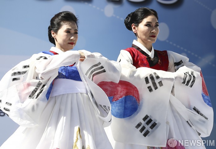 [서울=뉴스핌] 이한결 기자 = 14일 오전 서울 중구 서울역 광장에서 열린 '원코리아! 피스로드 2019 서울특별시 통일대장정'에서 한복 퍼포먼스가 펼쳐지고 있다. 2019.08.14 alwaysame@newspim.com