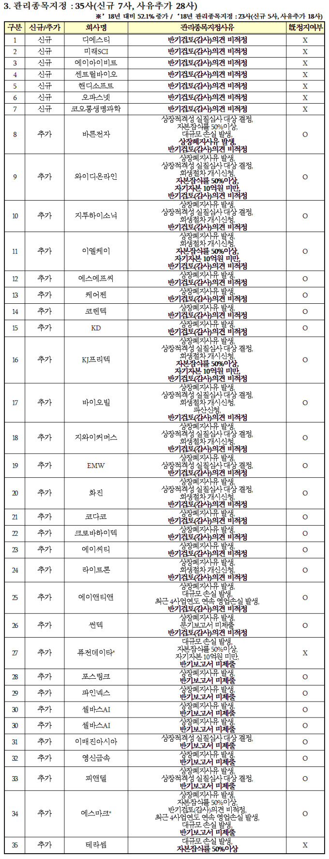 이밖에 와이디온라인, 이엘케이, KJ프리텍 등은 △자본잠식률 50% 이상 △자기자본 10억원 미만 △반기 감사의견 비적정으로 관리종목 지정 사유가 추가됐다.