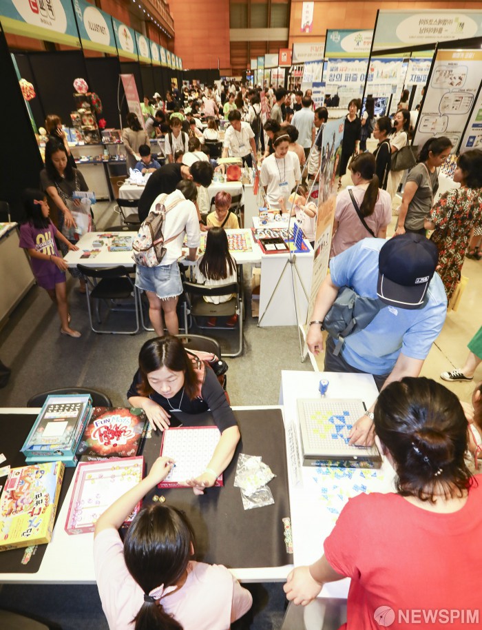 [서울=뉴스핌] 이한결 기자 = 16일 오후 서울 강남구 코엑스 D홀에서 열린 ‘2019 초등교육박람회’에서 참가자들이 초등교육 부스 체험을 하고 있다. 이번 초등교육박람회는 올해로 10회째를 맞아 ‘창의로 만드는 우리 세상’을 주제로 오는 18일까지 진행된다. 2019.08.16 alwaysame@newspim.com