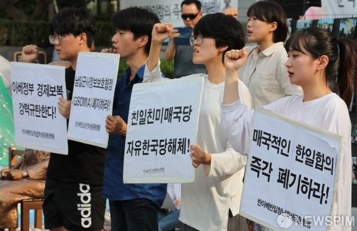[서울=뉴스핌] 백인혁 기자 = 반아베반일청년학생공동행동 회원들이 17일 오후 서울 종로구 옛 일본대사관 앞에서 1327일차 한일 위안부 합의 규탄 문화제를 열고 구호를 외치고 있다. 2019.08.17 dlsgur9757@newspim.com