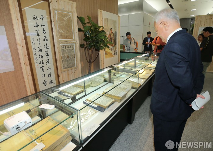 [서울=뉴스핌] 윤창빈 기자 = 19일 오전 서울 영등포구 광복회관에서 열린 ‘항일독립운동사료전시회(’독립혈전 I') 개막식에서 참가자들이 전시를 둘러보고 있다. 광복회와 (재)리준만국평화재단이 공동개최하는 이번 전시회는 이등박문 격살 기사 모음 일본신문 등 최초로 전시되는 20여점의 자료를 포함한 총 111점을 엄선하여 전시되며 오는 25일까지 계속된다. 2019.08.19 pangbin@newspim.com