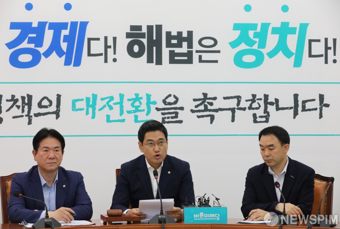 [서울=뉴스핌] 백인혁 기자 = 오신환 바른미래당 원내대표(가운데)가 22일 오전 서울 여의도 국회에서 열린 제53차 원내정책회의에서 모두발언을 하고 있다. 2019.08.22 dlsgur9757@newspim.com