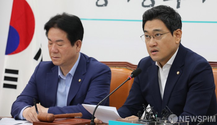 [서울=뉴스핌] 백인혁 기자 = 오신환 바른미래당 원내대표(오른쪽)가 22일 오전 서울 여의도 국회에서 열린 제53차 원내정책회의에서 모두발언을 하고 있다. 2019.08.22 dlsgur9757@newspim.com