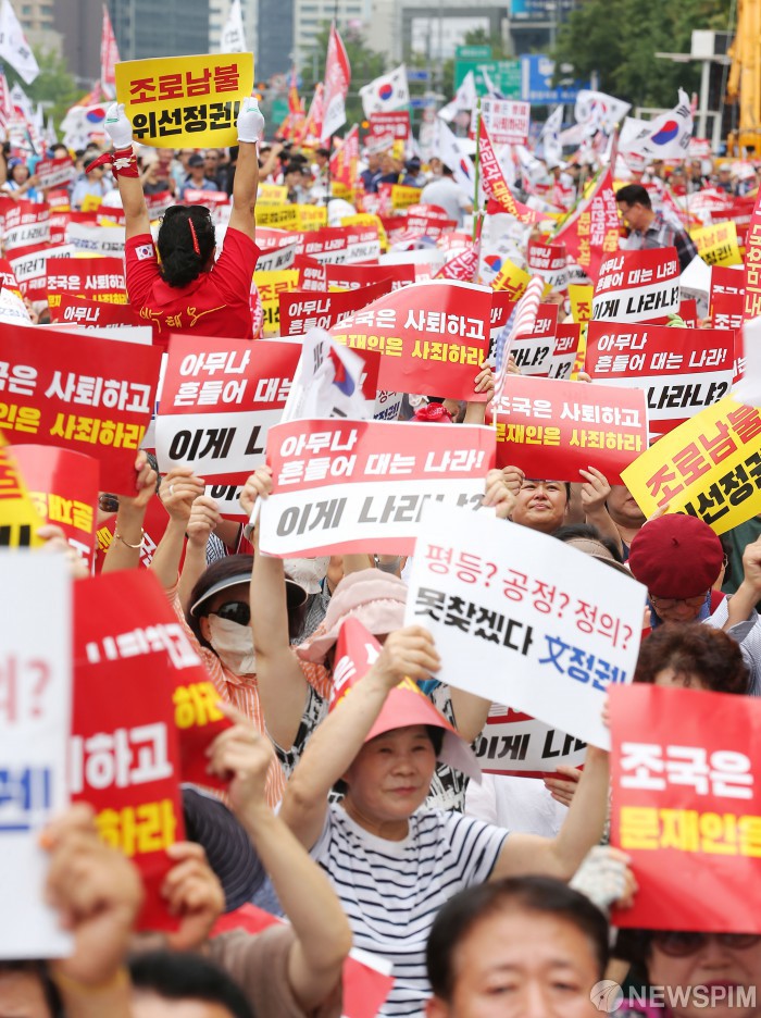 [서울=뉴스핌] 윤창빈 기자 = 24일 오후 서울 종로구 광화문광장에서 열린 ‘살리자 대한민국! 文정권 규탄 광화문 집회’에서 참가자들이 피켓을 들고 있다. 2019.08.24 pangbin@newspim.com