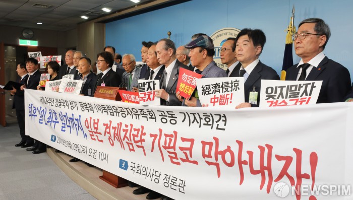 [서울=뉴스핌] 백인혁 기자 = 29일 오전 서울 여의도 국회 정론관에서 광복회 및 독립유공자유족회 관계자들이 일본 경제침략 규탄 기자회견을 하고 있다. 2019.08.29 dlsgur9757@newspim.com