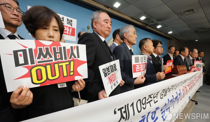 [서울=뉴스핌] 백인혁 기자 = 29일 오전 서울 여의도 국회 정론관에서 광복회 및 독립유공자유족회 관계자들이 일본 경제침략 규탄 기자회견을 하고 있다. 2019.08.29 dlsgur9757@newspim.com