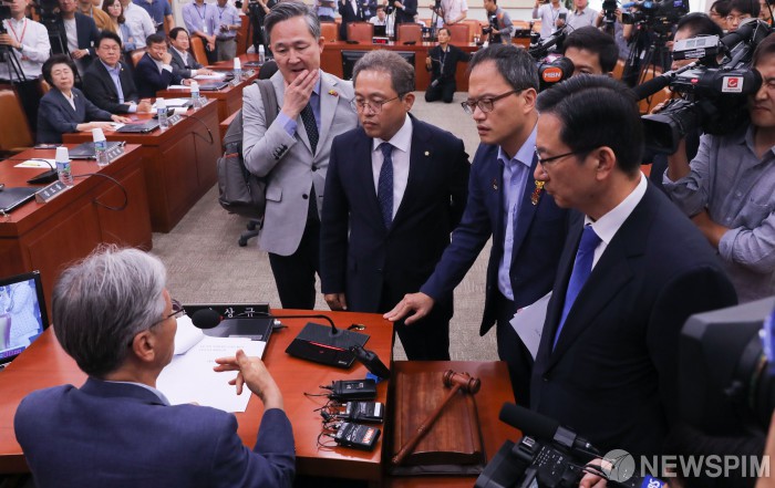 [서울=뉴스핌] 최상수 기자 = 2일 오전 서울 여의도 국회에서 열린 법제사법위원회 전체회의에서 송기헌 더불어민주당 간사를 비롯한 더불어민주당 소속 의원들이 여상규 위원장에게 항의하고 있다. 2019.09.02 kilroy023@newspim.com