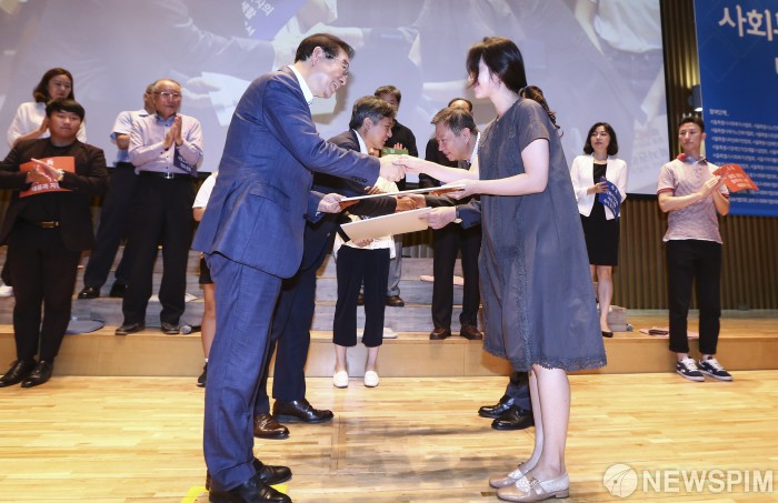 [서울=뉴스핌] 이한결 기자 = 박원순 서울시장과 신원철 서울시의회 의장이 5일 오후 서울 중구 서울시청에서 열린 ‘제20회 사회복지의 날 기념 2019 서울사회복지대회’에서 서울시민복지기준 2.0 전달 받고 있다. 2019.09.05 alwaysame@newspim.com