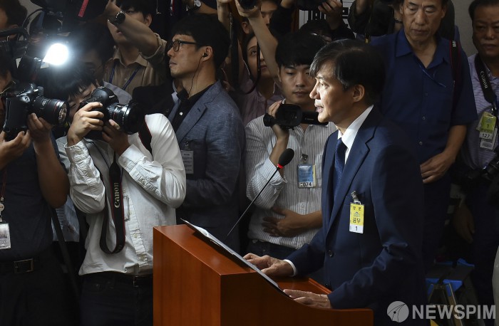 [서울=뉴스핌] 이형석 기자 = 조국 법무부 장관 후보자가 6일 오전 서울 여의도 국회에서 열린 법제사법위원회 인사청문회에서 모두발언을 하고 있다. 2019.09.06 leehs@newspim.com