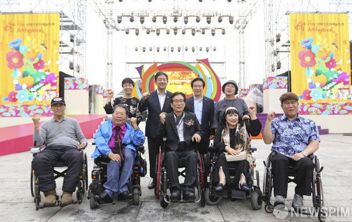 [서울=뉴스핌] 이한결 기자 = 박양우 문화체육관광부 장관과 홍이석 한국장애인문화예술단체총연합회 상임대표 및 관계자들이 6일 오후 서울 종로구 광화문광장에서 열린 ‘2019 장애인문화예술축제, A+ festival'에서 기념촬영을 하고 있다. 2019.09.06 alwaysame@newspim.com