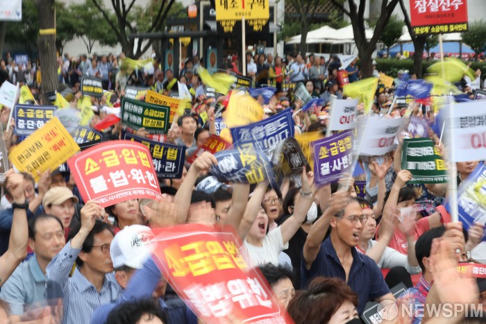 [서울=뉴스핌] 백인혁 기자 = 미래도시시민연대 회원들이 9일 오후 서울 종로구 세종대로 일대에서 분양가 상한제 소급적용 저지 총궐기대회를 열고 구호를 외치고 있다. 2019.09.09 dlsgur9757@newspim.com