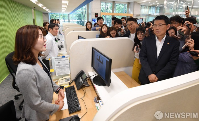 [서울=뉴스핌] 정일구 기자 = 은성수 금융위원장과 윤석헌 금융감독원장이 19일 오후 서울 영등포구 금융감독원 일본 수출규제 피해기업 상담센터를 방문해 직원들과 대화를 하고 있다. 2019.09.19 mironj19@newspim.com