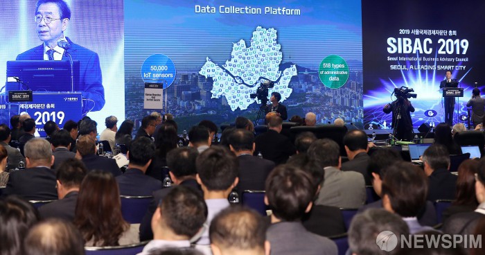 [서울=뉴스핌] 정일구 기자 = 박원순 서울시장이 20일 오전 서울 종로구 포시즌스 호텔에서 열린 '2019 서울국제경제자문단(SIBAC) 총회'에서 기조발표를 하고 있다. 2019.09.20 mironj19@newspim.com