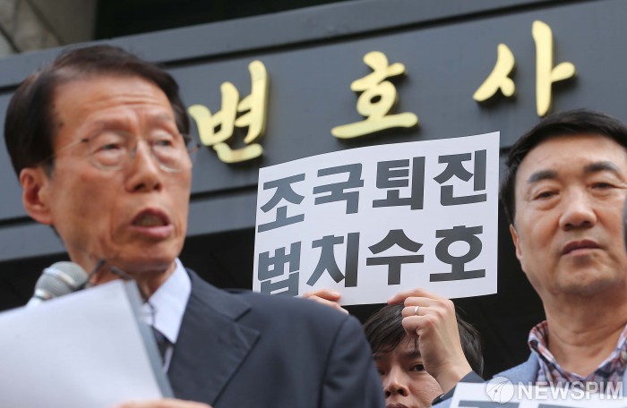 [서울=뉴스핌] 윤창빈 기자 = 한반도 인권과 통일을 위한 변호사모임 소속 변호사들이 26일 오후 서울 서초구 변호사회관 앞에서 조국퇴진·법치수호를 위한 변호사 시국선언을 열고 발언하고 있다. 2019.09.26 pangbin@newspim.com