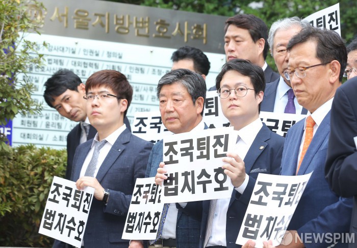 [서울=뉴스핌] 윤창빈 기자 = 한반도 인권과 통일을 위한 변호사모임 소속 변호사들이 26일 오후 서울 서초구 변호사회관 앞에서 조국퇴진·법치수호를 위한 변호사 시국선언을 열고 피켓을 들고 있다. 2019.09.26 pangbin@newspim.com