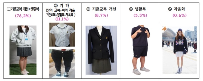 기존 교복에 생활복을 학교가 지정하는 형태가 76.2%(343곳)로 가장 높았다.