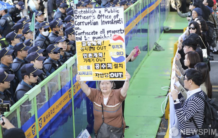 [서울=뉴스핌] 이한결 기자 = 9일 오후 서울 종로구 광화문광장에서 문재인하야 범국민투쟁본부 주최로 열린 ‘문재인 탄핵 10.9 천만 국민대회’에서 참석자들이 청와대 방향으로 행진을 진행하는 가운데 조국 장관의 지지자가 피켓을 들고 있다. 이날 집회에서는 조국 법무부 장관 퇴진과 문재인 대통령 하야 등을 촉구했다. 2019.10.09 alwaysame@newspim.com
