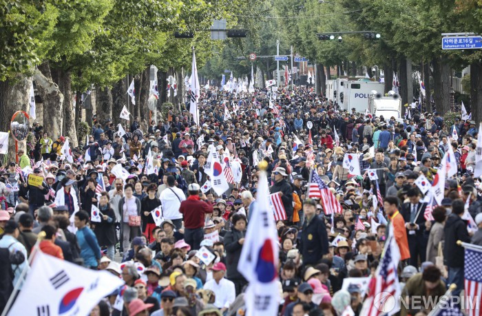 [서울=뉴스핌] 이한결 기자 = 9일 오후 서울 종로구 광화문광장에서 문재인하야 범국민투쟁본부 주최로 열린 ‘문재인 탄핵 10.9 천만 국민대회’에서 참석자들이 구호를 외치고 있다. 이날 집회에서는 조국 법무부 장관 퇴진과 문재인 대통령 하야 등을 촉구했다. 2019.10.09 alwaysame@newspim.com