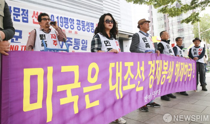 [서울=뉴스핌] 이형석 기자 = 반미공동행동이 10일 오후 서울 종로구 광화문KT 앞에서 반미·반전 집회를 열고 있다. 2019.10.10 leehs@newspim.com