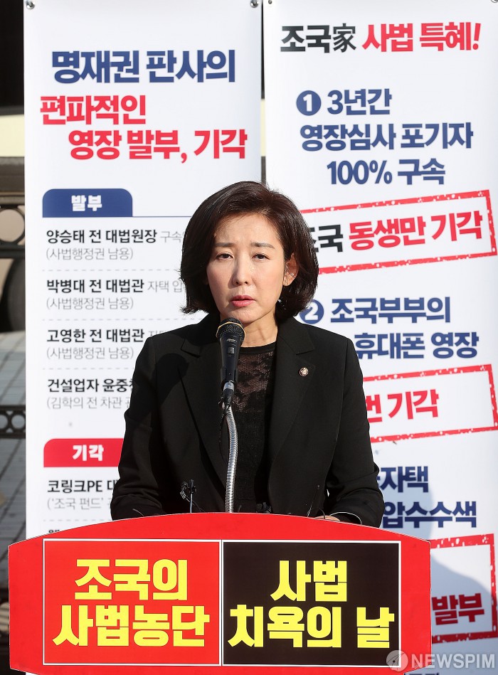 [서울=뉴스핌] 정일구 기자 = 나경원 자유한국당 원내대표가 11일 오전 서울 서초구 대법원 앞에서 열린 '文정권 사법농단 규탄' 현장 국정감사대책회의에서 발언을 하고 있다. 2019.10.11 mironj19@newspim.com