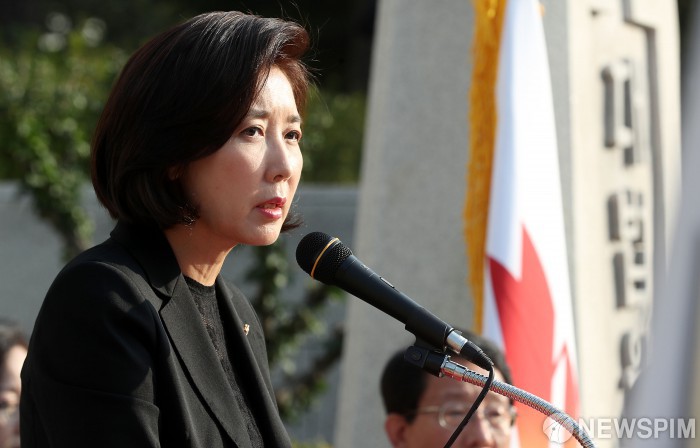 [서울=뉴스핌] 정일구 기자 = 나경원 자유한국당 원내대표가 11일 오전 서울 서초구 대법원 앞에서 열린 '文정권 사법농단 규탄' 현장 국정감사대책회의에서 발언을 하고 있다. 2019.10.11 mironj19@newspim.com