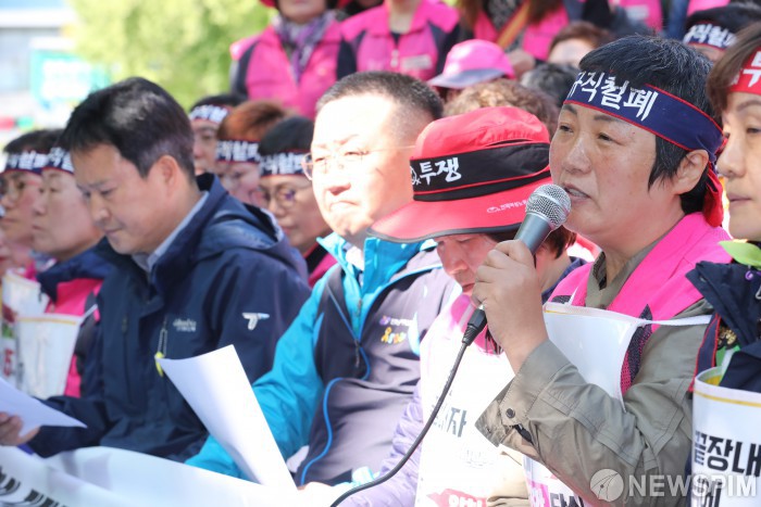 [서울=뉴스핌] 백인혁 기자 = 학교 비정규직 노동자들과 교육 당국이 임금 교섭에 합의를 이룬 15일 오전 서울 종로구 청와대 앞 전국학교비정규직 조합원들이 집단 단식 해단 및 총파업 중단 발표 기자회견을 하고 있다. 2019.10.15 dlsgur9757@newspim.com