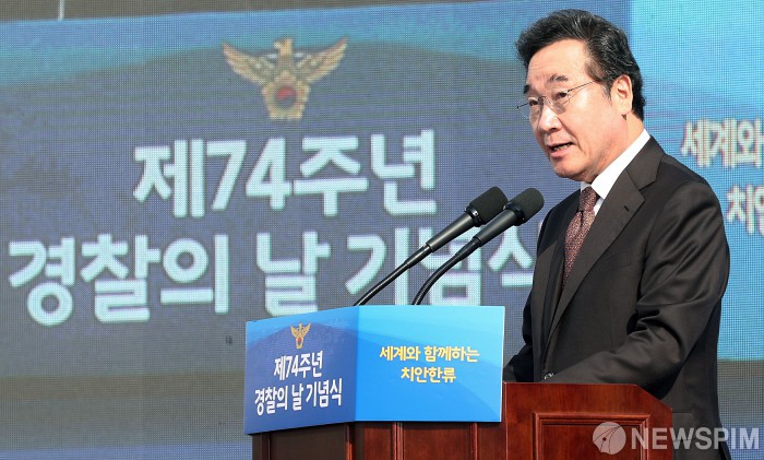 [인천=뉴스핌] 정일구 기자 = 이낙연 국무총리가 21일 오전 인천 연수구 송도컨벤시아에서 열린 '제74주년 경찰의 날 기념식'에서 축사를 하고 있다. 2019.10.21 mironj19@newspim.com