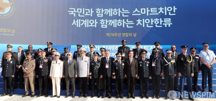 [인천=뉴스핌] 정일구 기자 = 이낙연 국무총리가 21일 오전 인천 연수구 송도컨벤시아에서 열린 '제74주년 경찰의 날 기념식'에서 민갑룡 경찰청장 등 세계 각국 경찰 관계자들과 기념촬영을 하고 있다. 2019.10.21 mironj19@newspim.com