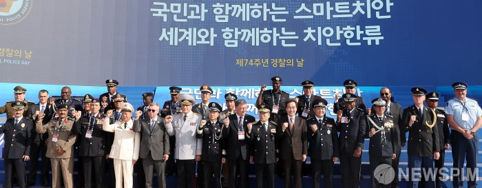 [인천=뉴스핌] 정일구 기자 = 이낙연 국무총리가 21일 오전 인천 연수구 송도컨벤시아에서 열린 '제74주년 경찰의 날 기념식'에서 민갑룡 경찰청장 등 세계 각국 경찰 관계자들과 기념촬영을 하고 있다. 2019.10.21 mironj19@newspim.com