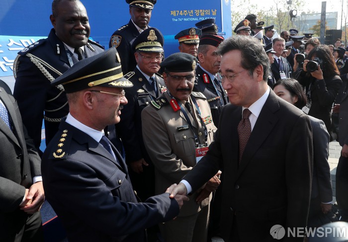 [인천=뉴스핌] 정일구 기자 = 이낙연 국무총리가 21일 오전 인천 연수구 송도컨벤시아에서 열린 '제74주년 경찰의 날 기념식'에서 세계 각국 경찰 관계자들과 인사를 하고 있다. 2019.10.21 mironj19@newspim.com