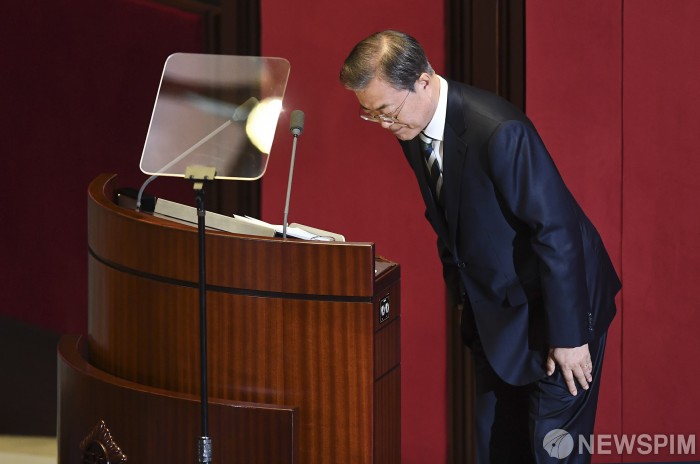 [서울=뉴스핌] 국회사진취재단 = 문재인 대통령이 22일 오전 서울 여의도 국회 본회의장에서 2020년도 예산안 시정연설을 마친 뒤 인사하고 있다. 2019.10.22.