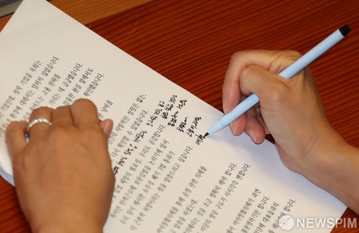 [서울=뉴스핌] 국회사진취재단 = 나경원 자유한국당 대표가 22일 열린 국회 본회의에서 문재인 대통령의 예산안 시정연설을 들으며 '보고싶은 것만 보고', '고집이' 등의 메모를 하고 있다. 2019.10.22