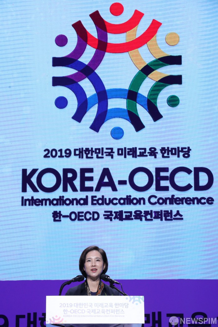 [고양=뉴스핌] 백인혁 기자 = 유은혜 부총리 겸 교육부 장관이 23일 오전 경기도 고양시 킨텍스 제2전시장에서 열린 한-OECD 국제교육컨퍼런스 2019 대한민국 미래교육 한마당 개막식에서 개회사를 하고 있다. 2019.10.23 dlsgur9757@newspim.com