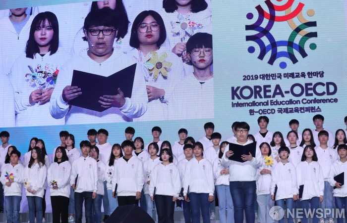 [고양=뉴스핌] 백인혁 기자 = 23일 오전 경기도 고양시 킨텍스 제2전시장에서 열린 한-OECD 국제교육컨퍼런스 2019 대한민국 미래교육 한마당 개막식에서 학생들이 어린이·청소년 교육·문화 권리 선언식을 하고 있다. 2019.10.23 dlsgur9757@newspim.com