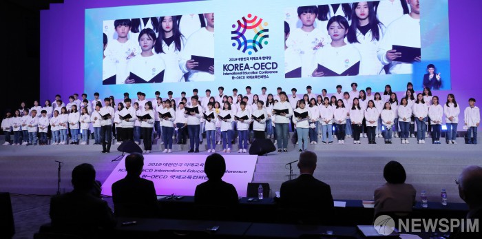 [고양=뉴스핌] 백인혁 기자 = 23일 오전 경기도 고양시 킨텍스 제2전시장에서 열린 한-OECD 국제교육컨퍼런스 2019 대한민국 미래교육 한마당 개막식에서 학생들이 어린이·청소년 교육·문화 권리 선언식을 하고 있다. 2019.10.23 dlsgur9757@newspim.com