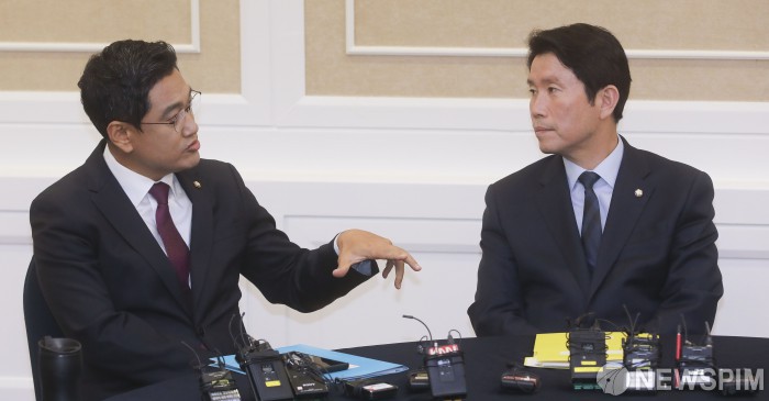 [서울=뉴스핌] 최상수 기자 = 오신환 바른미래당 원내대표, 이인영 더불어민주당 원내대표가 23일 오후 서울 여의도 국회에서 열린 여야3당 교섭단체 선거법 3+3 회동에서 대화를 나누고 있다. 2019.10.23 kilroy023@newspim.com