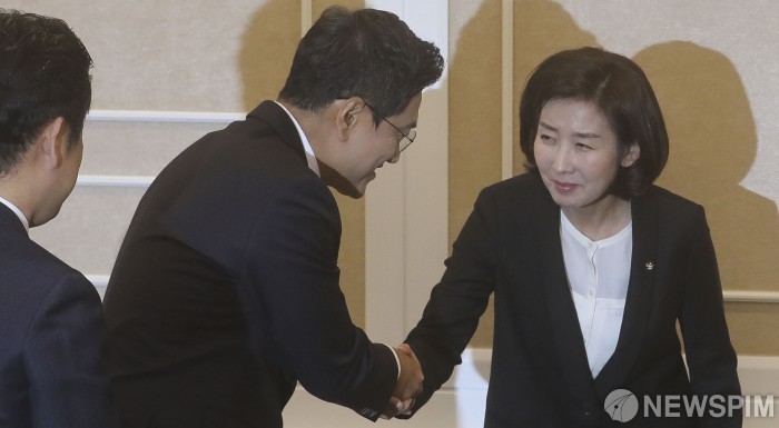 [서울=뉴스핌] 최상수 기자 = 오신환 바른미래당 원내대표, 나경원 원내대표가 23일 오후 서울 여의도 국회에서 열린 여야3당 교섭단체 선거법 3+3 회동에서 악수를 나누고 있다. 2019.10.23 kilroy023@newspim.com
