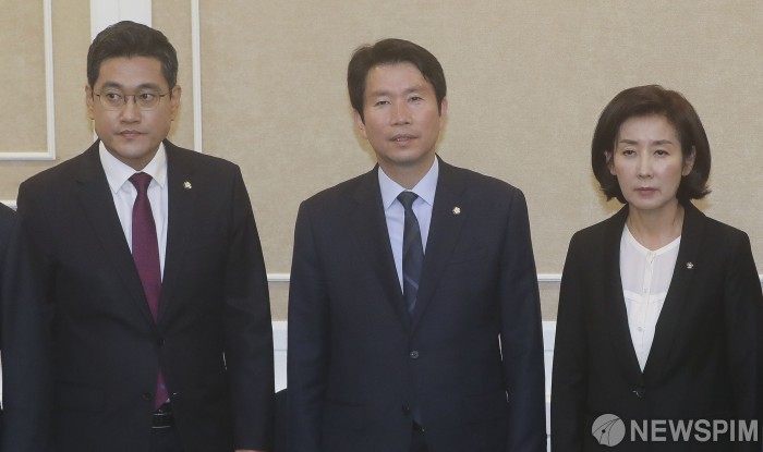 [서울=뉴스핌] 최상수 기자 = 오신환 바른미래당 원내대표(왼쪽부터), 이인영 더불어민주당 원내대표, 나경원 자유한국당 원내대표가 23일 오후 서울 여의도 국회에서 열린 여야3당 교섭단체 선거법 3+3 회동에서 기념촬영을 하고 있다. 2019.10.23 kilroy023@newspim.com