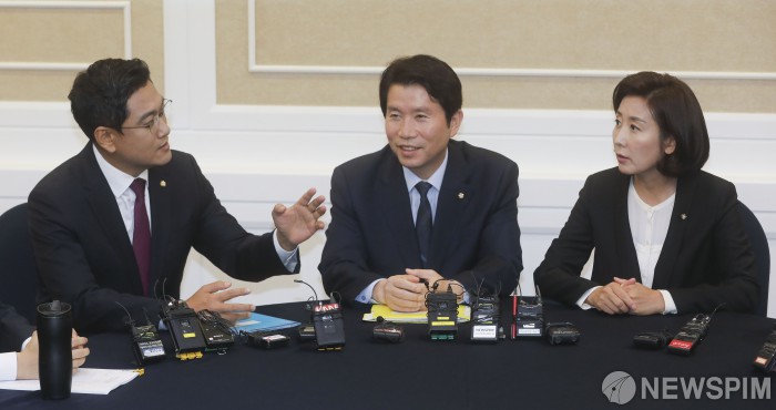 [서울=뉴스핌] 최상수 기자 = 오신환 바른미래당 원내대표(왼쪽부터), 이인영 더불어민주당 원내대표, 나경원 자유한국당 원내대표가 23일 오후 서울 여의도 국회에서 열린 여야3당 교섭단체 선거법 3+3 회동에서 대화를 나누고 있다. 2019.10.23 kilroy023@newspim.com