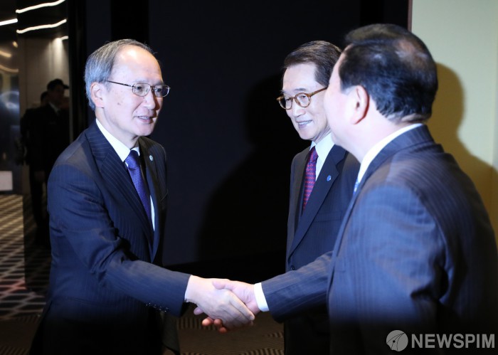 [서울=뉴스핌] 백인혁 기자 = 나가미네 야스마사 주한일본대사(왼쪽)가 24일 오후 서울 중구 플라자 호텔 그랜드볼룸에서 열린 제74회 유엔의 날 기념 오찬 행사에서 참석자들과 인사를 나누고 있다. 2019.10.24 dlsgur9757@newspim.com
