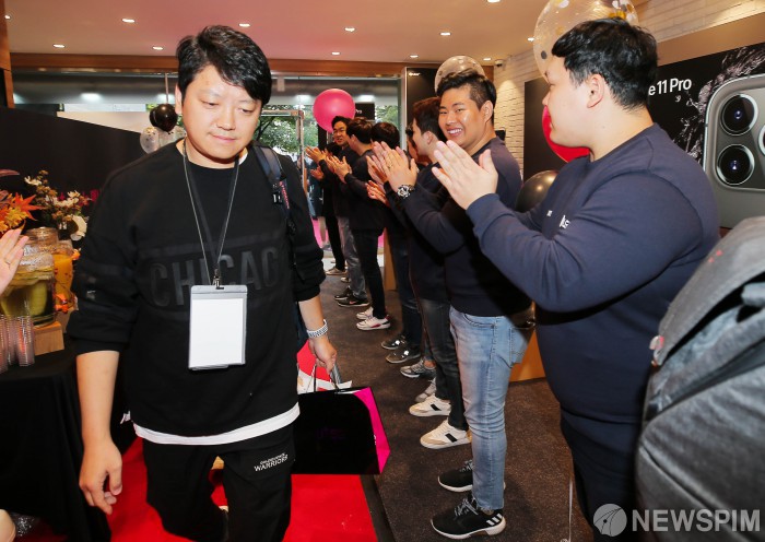 [서울=뉴스핌] 윤창빈 기자 = 25일 오전 서울 강남구 LG유플러스 강남직영점에서 열린 아이폰 11 출시기념 행사에서 추첨으로 선발된 애플 단말기 마니아들이 직원들 박수를 받으며 매장에 입장하고 있다. 2019.10.25 pangbin@newspim.com