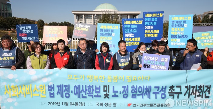 [서울=뉴스핌] 백인혁 기자 = 전국민주노동조합총연맹 이 4일 오전 서울 여의도 국회 앞에서 사회서비스원 법 제정·예산확보 및 노·정 협의체 구성 촉구 기자회견을 열고 발언을 하고 있다. 2019.11.04 dlsgur9757@newspim.com