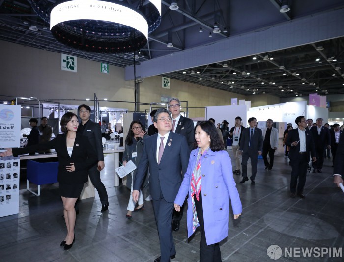 [고양=뉴스핌] 백인혁 기자 = 정승일 산업통상자원부 차관과 윤주현 한국디자인진흥원 원장이 6일 오후 경기 고양시 킨텍스 제1전시장에서 열린 디자인 코리아 페스티벌(DK FESTIVAL) 개막식을 마치고 행사장을 둘러보고 있다. 2019.11.06 dlsgur9757@newspim.com