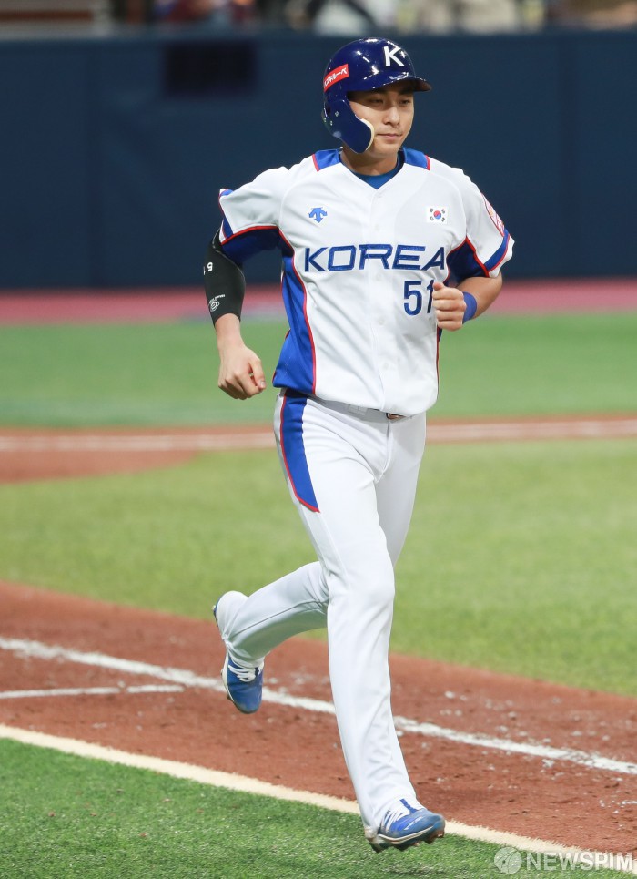 [서울=뉴스핌] 최상수 기자 = 6일 오후 서울 구로구 고척스카이돔에서 진행된 '2019 WBSC 프리미어 12' 그룹 C조 경기에서 8회 말 이정후선수가 볼넷으로 출루하고 있다. 2019.11.06 kilroy023@newspim.com